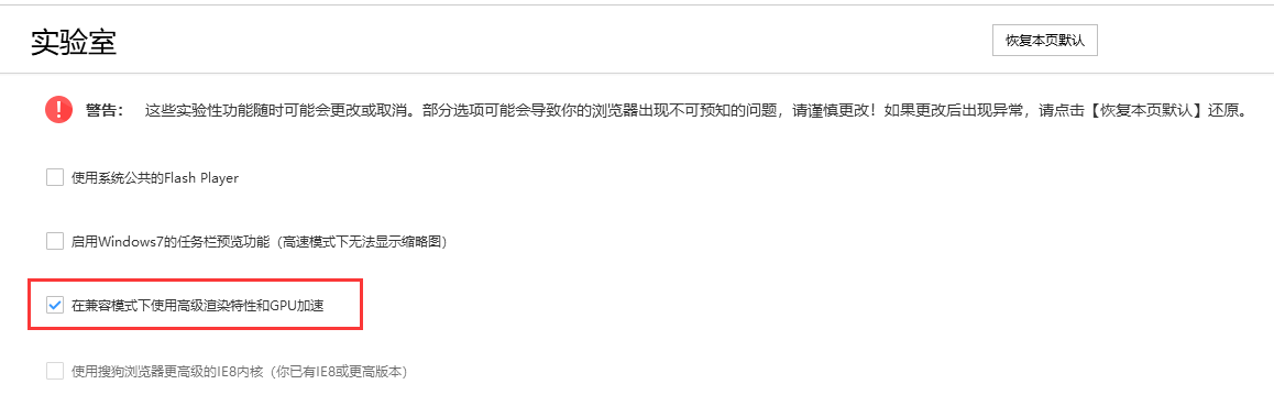 点击【在兼容模式下是使用高级渲染特性和GPU加速】,开启硬件加速。