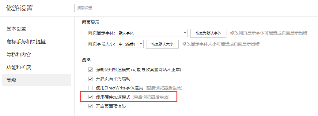选择【其他】,点击【使用硬件加速模式(重启浏览器后生效)】