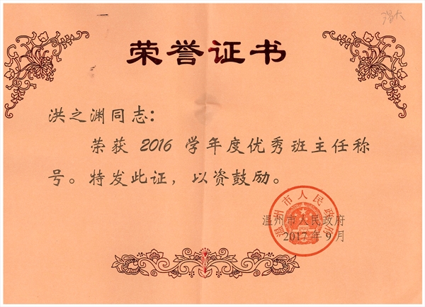 喜报:澳门六合彩官网 洪之渊老师荣获2016学年度“优秀班主任”