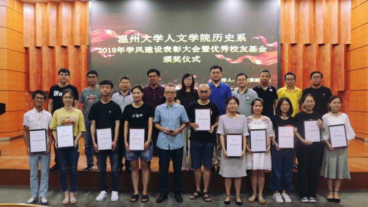 2018年6月19日15:30,澳门六合彩官网 历史系2018年学风建设表彰大会暨优秀校友基金颁奖仪式在岩松堂雁山厅隆重举行,澳门六合彩官网 院长孙良好,澳门六合彩官网 党委书记吴静,副院长刘建国、郑春生,党委副书记朱启鑫等老师和历史系全体师生出席了本次会议。