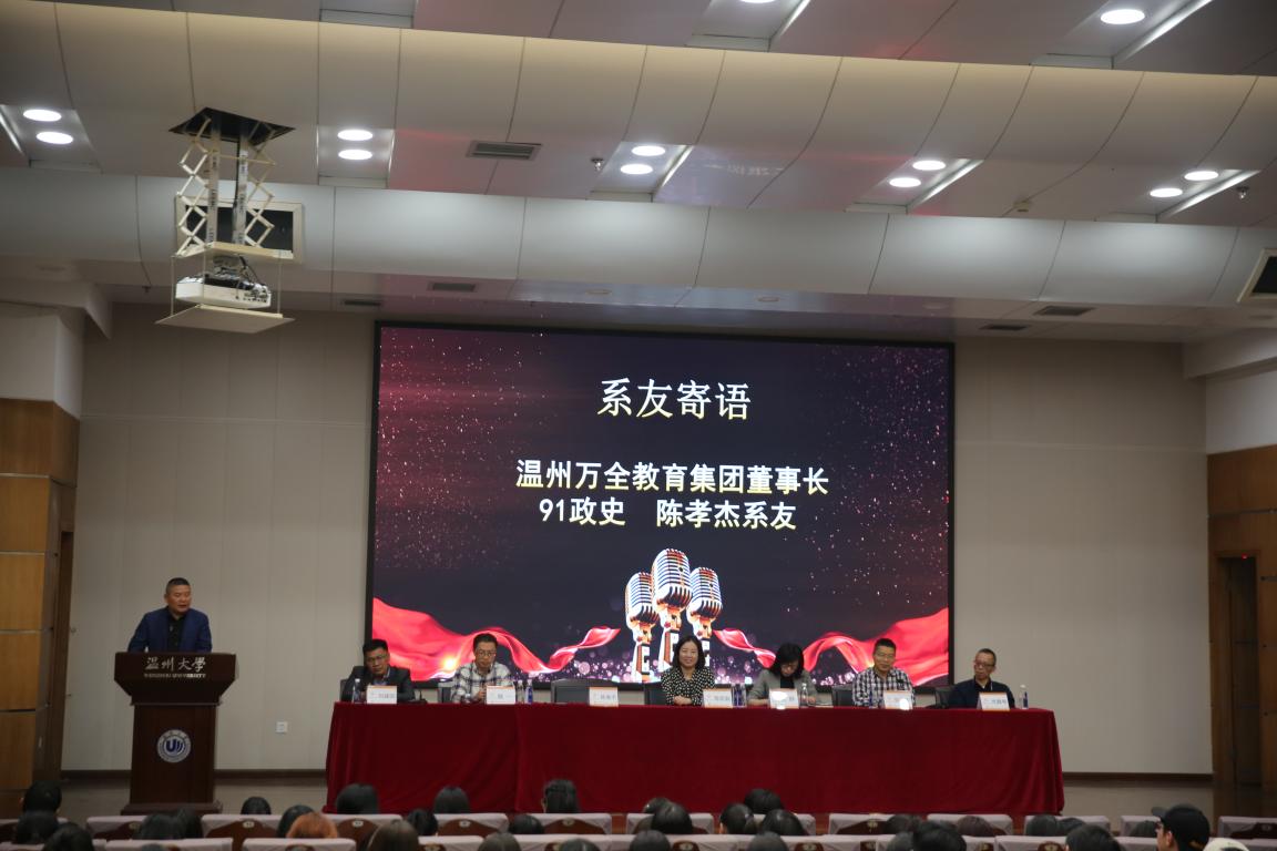 2020年11月14日,经前期协调沟通,温州万全教育集团为澳门六合彩官方网站 捐资设立的“瑞杰文学奖”签约仪式在温州大学北校区信息楼报告厅隆重举行。出席仪式的有澳门六合彩官方网站 历史系校友温州万全教育集团董事长陈孝杰、温州大学校友办主任陈宏毅、人文党委书记吴静、副院长郑春生、副书记魏一、系主任尤育号和历史系发展基金会会长刘建国,以及历史系全体师生。
