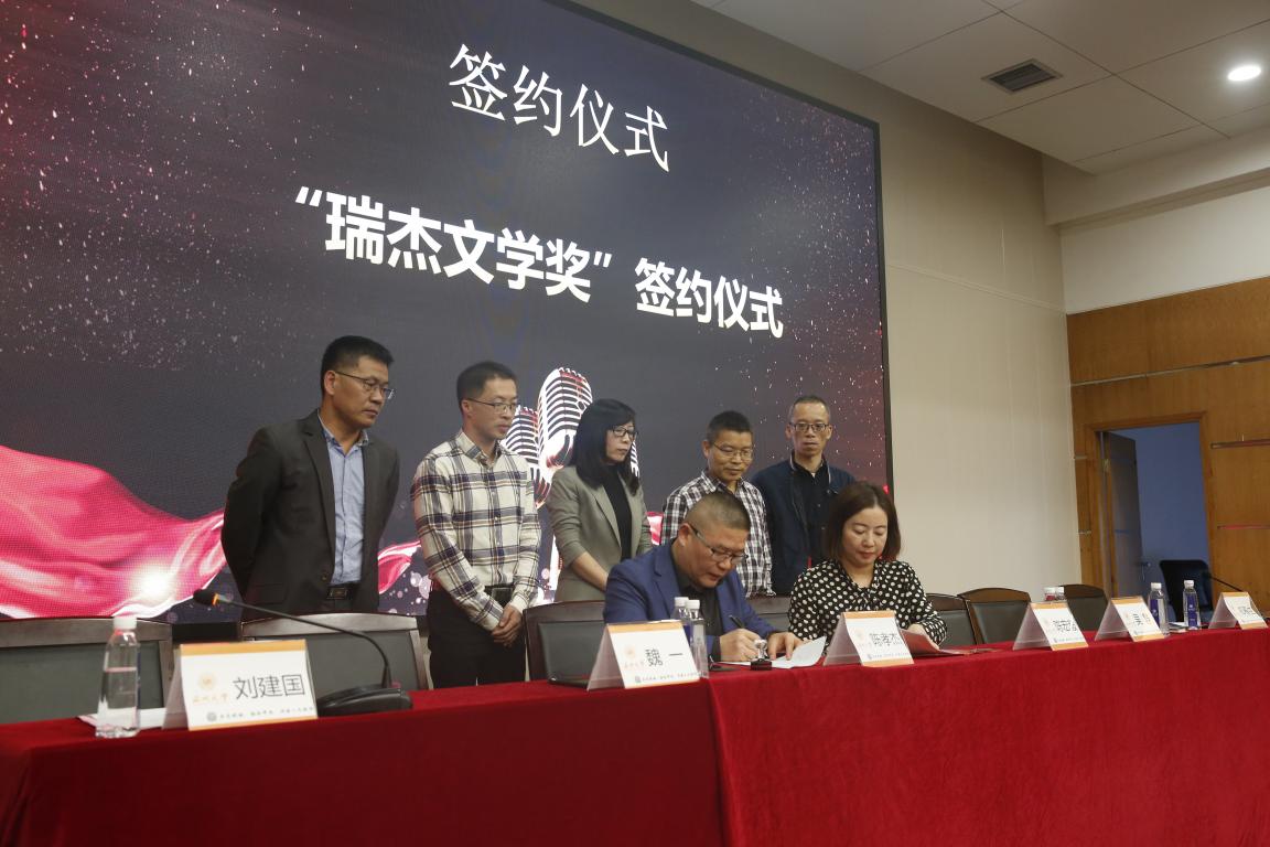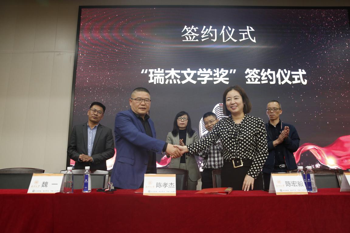 此次“瑞杰文学奖”是澳门六合彩官方网站 历史系校友陈孝杰先生为支持温州大学教育发展,鼓励澳门六合彩官方网站 学生奋发向上,大胆追求自己的文学梦想,促进学生专业能力的发展,同时激发出众多文学爱好者们强烈的创作激情特捐资15万元设立“瑞杰文学奖”专项奖学金,用于奖励温州大学具有文学特长学生,以及推动澳门六合彩官网 学生文学创作发展所需的资金。仪式上温州万全教育集团董事长陈孝杰与校友办主任陈宏毅共同签署了合作协议。