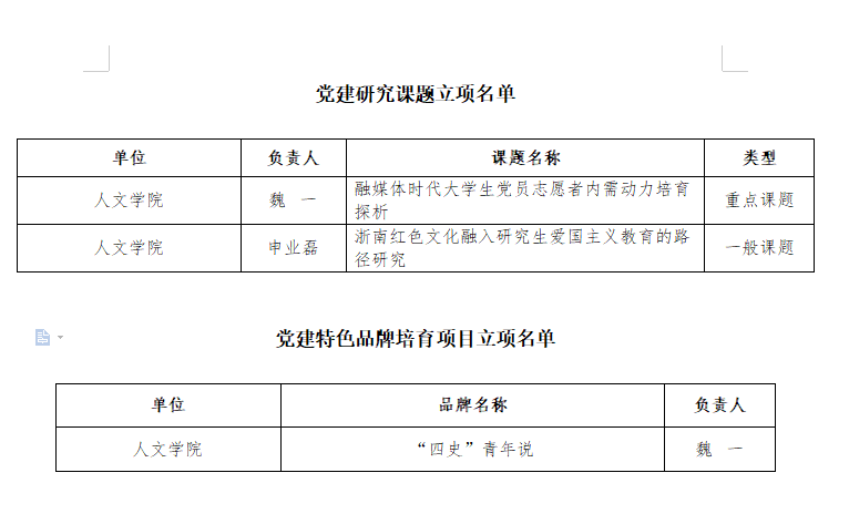 12月18日,根据《关于组织申报2021年校级党建研究课题和党建特色品牌培育项目的通知》精神,经单位推荐、专家评审等程序,澳门六合彩官网 魏一副书记《融媒体时代大学生党员志愿者内需动力培育探析》获校级党建研究课题重点课题立项,辅导员申业磊《浙南红色文化融入研究生爱国主义教育的路径研究》获校级党建研究课题一般课题立项,《“四史”青年说》获党建特色品牌培育项目立项。