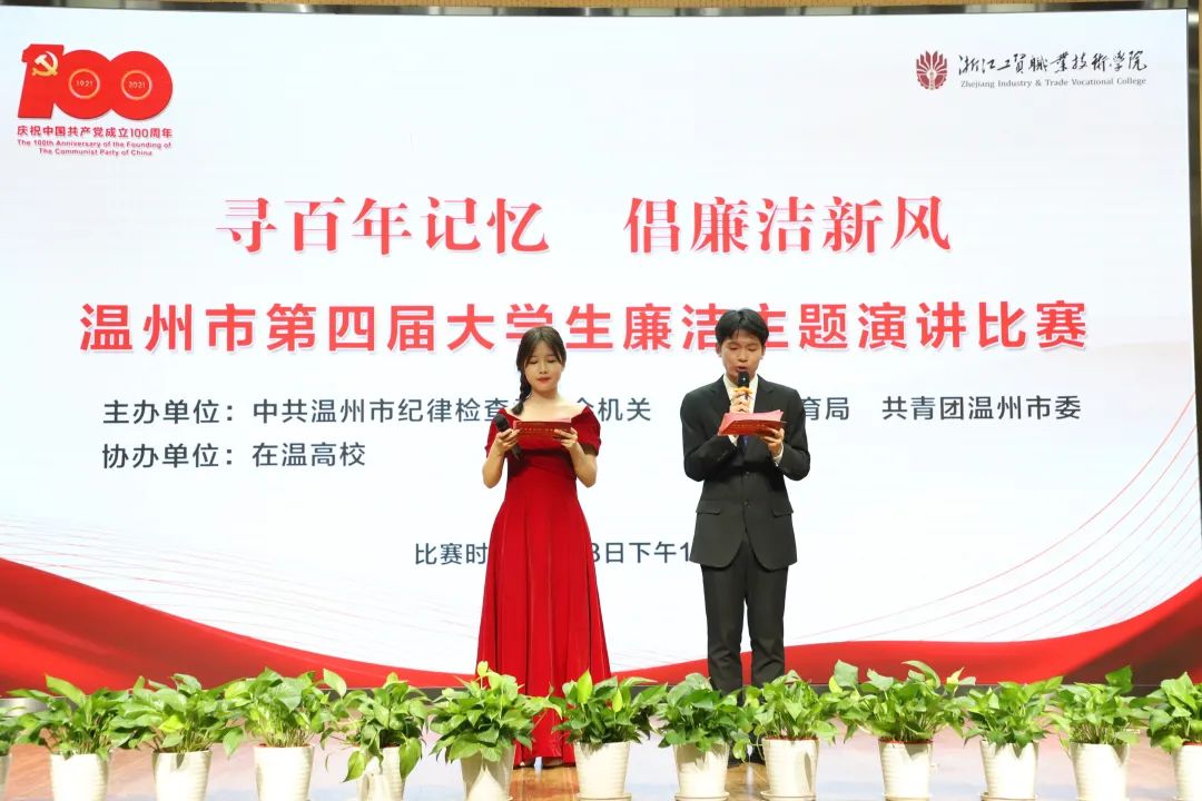 为庆祝中国共产党建党100周年,进一步加强高校大学生廉洁教育,助力“清廉温州”建设,5月28日(周五) 下午13:00,温州市纪委、温州市教育局、共青团温州市委于温州市瓯江口产业集聚区雁云路301号浙江工贸职业技术澳门六合彩官网 行政楼105报告厅举办了温州市第四届大学生廉洁主题演讲比赛决赛。