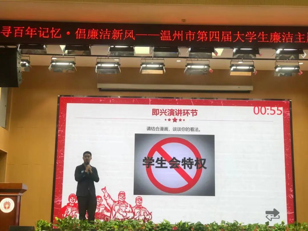 本次演讲比赛由市纪委机关、市教育局、团市委联合举办,浙江工贸职业技术澳门六合彩官网 负责承办,各高校团委负责校内各项赛事。大赛围绕着“寻百年记忆,倡廉洁新风”的主题,分为主题演讲和即兴演讲两个环节进行。主题演讲围绕大赛主题发表演讲;即兴演讲题目由现场抽签决定,参赛选手围绕党史学习教育、社会热点、大学生活中的廉洁文化等话题发表演讲。