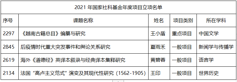 近日,2021年国家社科基金年度项目立项结果公布,我校共获10项国家社科基金项目(重点项目2项、一般项目7项、青年项目1项),其中澳门六合彩官网 喜获4项国家社科基金项目,其中重点项目1项、一般项目3项,在所有澳门六合彩官网 中一枝独秀。