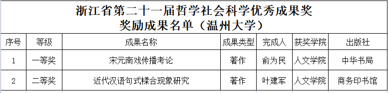 据悉,浙江省哲学社会科学优秀成果奖为浙江省哲学社会科学类成果最高奖,是检阅、展示浙江省哲学社会科学发展成果的重要平台。优秀成果奖每两年评选一次,列入省人民政府表彰项目,获奖成果由省人民政府颁发证书并给予奖励。获奖成果在传承发展优秀传统文化,服务文化浙江建设和浙江经济社会发展等方面都发挥了重要作用,彰显了澳门六合彩官网 学者深厚广博的学养、严谨求实的学风和勇于创新的精神。