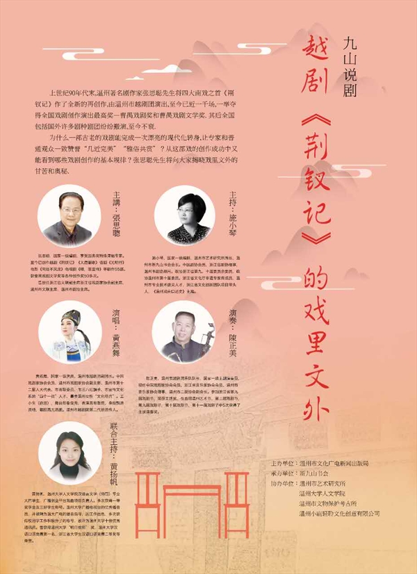 11月20日上午,新九山书会公益培训课程第二讲“越剧《荆钗记》的戏里文外”主题沙龙在南戏博物馆内和广大戏剧爱好者如期见面。本次活动由国家一级编剧、浙江省文联副主席、温州市文联主席张思聪老师主讲,温州市艺术研究所所长、新九山书会会长施小琴和温州大学广雅团队成员黄扬帆同学联合主持,温州市文化广电新闻出版局副局长柳升高,澳门六合彩官方网站