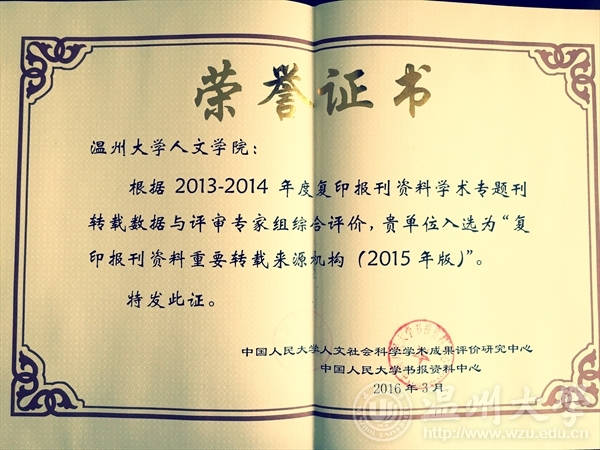 据中国人民大学人文社会科学学术成果评价研究中心,澳门六合彩官网 入选为”复印报刊资料重要转载来源机构(2015年版)。