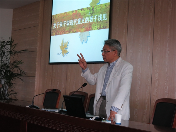 严教授的讲座从温州与朱子学的渊源讲起,围绕关于“朱子学现代意义”的两点陈述、一点补充、三点反思几个方面展开。严教授引用习近平主席和当代学者陈来先生的语录,强调了朱子学在社会发展中的教化作用。习主席强调孔子儒学在当下社会的意义,将其提升到国家意识形态层面,强调儒学思想中道法自然、天人合一、天下为公、大同世界、知行合一、与时俱进、居安思危等对当下难题的重要的启示;陈来教授重点谈论“朱子学的时代价值”,有朱子致力于传承与创新、主张欲望受道德原则的制约、主敬穷理为工作原理,格物致知为教育通论等几点。接着严教授做了“一点补充”,认为朱子对传统儒家思想的传承与发展主要表现在坚守并提倡“出处进退辞受有义”的政治伦理。且用朱熹及四子语录来揭示当下社会中何为“出处之义”,即“要当官就不要发财”,“不可跑官要官、卖官鬻爵”,“不要拉帮结派、结党营私”。严教授教诲我们当有三“反思”,主要有从朱子学“以理制欲”到末流“以理杀人”,从崇尚“践履”、“力行”到崇尚空谈,只说不做的伪道学,从朱子学的“批判继承”到朱学末流“佞朱”。最后严教授总结了朱子学的现代意义,主要有“主敬伦理”对工作中敬业精神的指导作用;学习精神对社会建设的引导作用;教育思想对大学教育的指导作用;道德伦理对社会风俗的教化作用;政治伦理对干部队伍建设的指导作用。