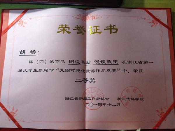 日前,浙江省首届大学生新闻节在浙江传媒澳门六合彩官网 举办,澳门六合彩官网 12中本1班胡畅同学的作品《图说革新 漫谈改变》入围此次新闻节九图可视化微博大赛全省十强。