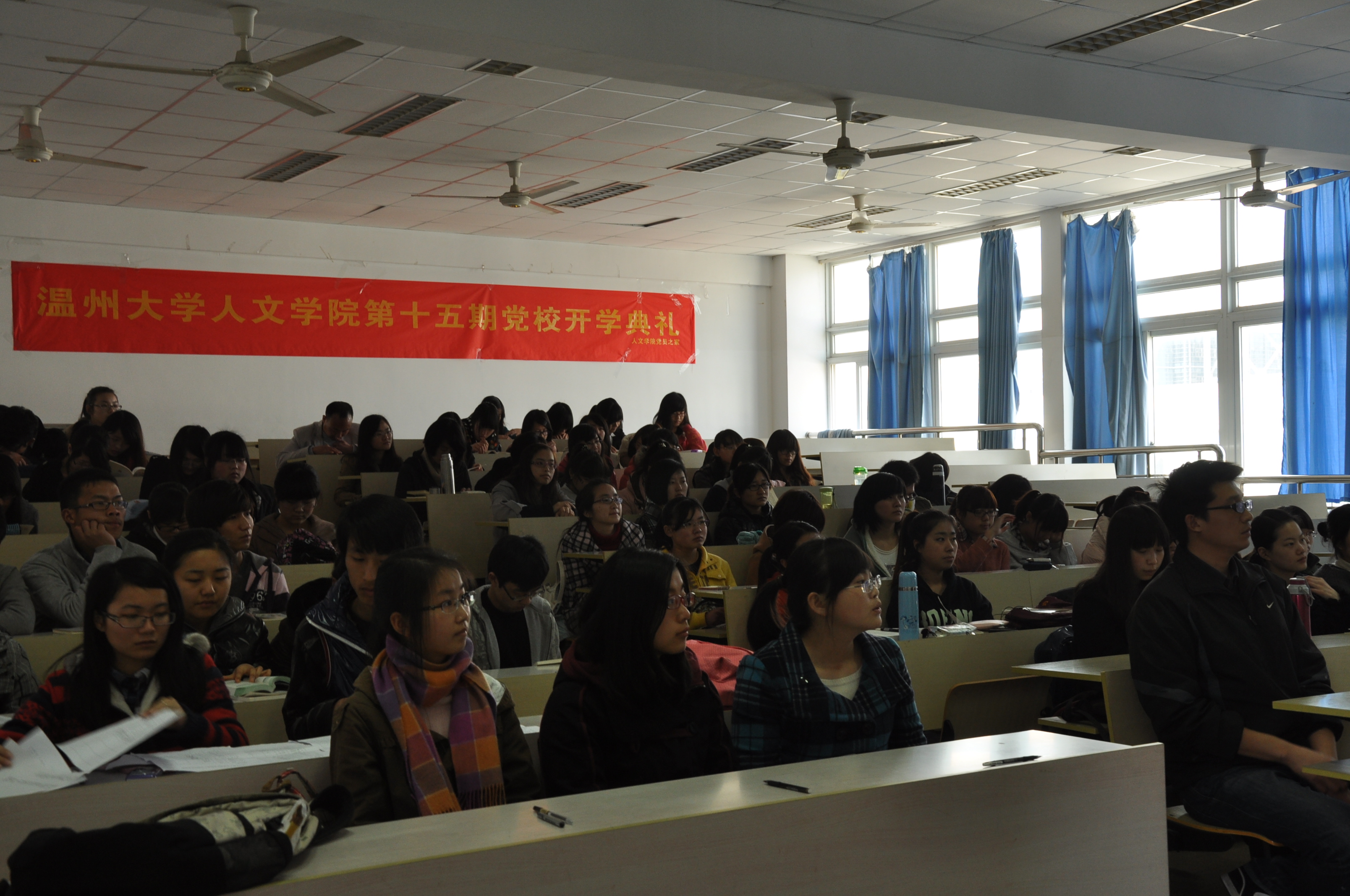 2012年3月21日下午14时,在北校区1-302教室举行了澳门六合彩官网 第十五期党校开学典礼暨如何树立正确的入党动机讲座。出席开学典礼的有澳门六合彩官网 党总支书记周剑平老师,澳门六合彩官网 研究生辅导员刘纪峰老师,以及51名预备党员和77名党校学员。