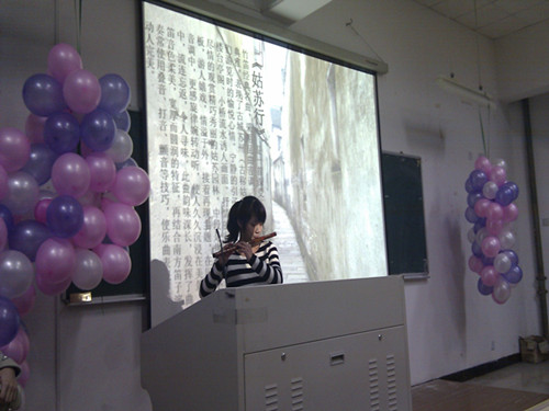 在一阵热烈的掌声后,比赛正式开始。每个选手要完成3个任务,分别是自我介绍,才艺展示和栏目展播。完成这些后,由校知名主持人组成的评委组进行即兴点评。各位选手真是多才多艺,其中10号选手沈亦辰在才艺表演中吹奏了独具中国江南特色的笛子,悠扬的曲调《姑苏行》飘散开来,带我们进入到如梦似幻的水乡小镇中。一曲罢了,全场掌声雷动,评委们也听得如痴如醉。如此出色的表演,使她顺利进入到决赛中。