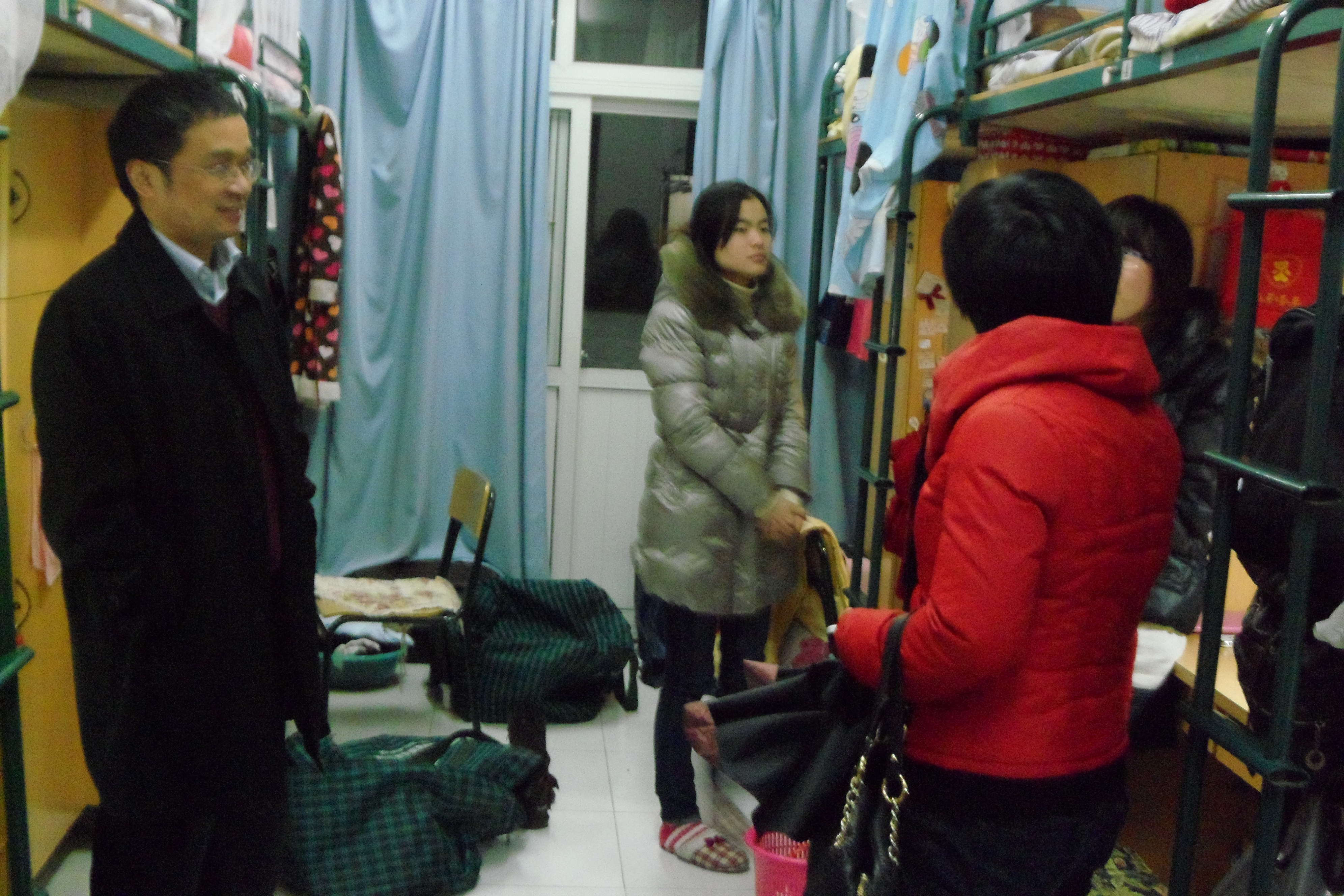 老师们首先走进了09本三的寝室,大家有的刚刚到校,正在整理衣物,一屋子的人说说笑笑,谈着各自的寒假生活,老师的到来更是增添了大家的兴致,谈家乡,谈春节习俗,骆书记叮嘱大家一定要调整好状态,拿出饱满的精气神来迎接新的学期。接着我们又走进广本,历本的寝室,老师也极耐心地一遍又一遍地叮嘱大家,不论是在学习方面还是在生活方面调整状态都十分重要。