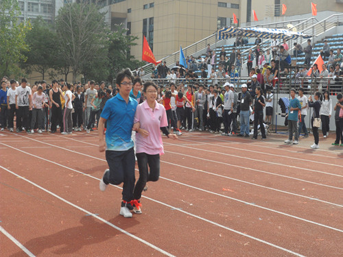 打响集体比赛第一枪的是两人三足的项目。比赛时,男生和女生的左右脚被绑在一起,并使用新产生的三足进行来回接力赛。只见他们手挽手肩并肩,喊着"一,二,一"的口号紧张又小心地向前跑出去,绕着杆子跳一个圈,又"一,二,一"地跑回来。女生被牵拉着,又叫又嚷,"慢点,慢点!"一眨眼却换了下一组。下一组迅速绑好绳子,深吸一口气,又跑开去。一不小心,节奏不对被对方绊了一跤,女生"呀"地跌倒,男生赶紧扶起来,来不及拍掉身上的尘土,又往前跑去。锣鼓声声,激荡在耳边的呐喊督促着他们顾不得脚踝被勒得生疼继续跑。最后一组了,男生几乎是架起了身边的女生,飞也似的放开脚步向终点猛冲,当脚踩到终点线的一刹那,两人便扑到在了地上,"哗"地笑开了。"刚刚我们就是一个人在跑!"他们如是说。
