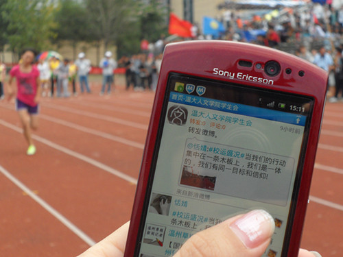 当我们把镜头聚焦到温州大学第三十四届校园运动会的时候,我们会发现许多拇指一族活跃在运动会的各个角落,他们用自己的手机拍下运动会的精彩瞬间并立即上传到微博上,及时有效地和大家分享火热赛事。