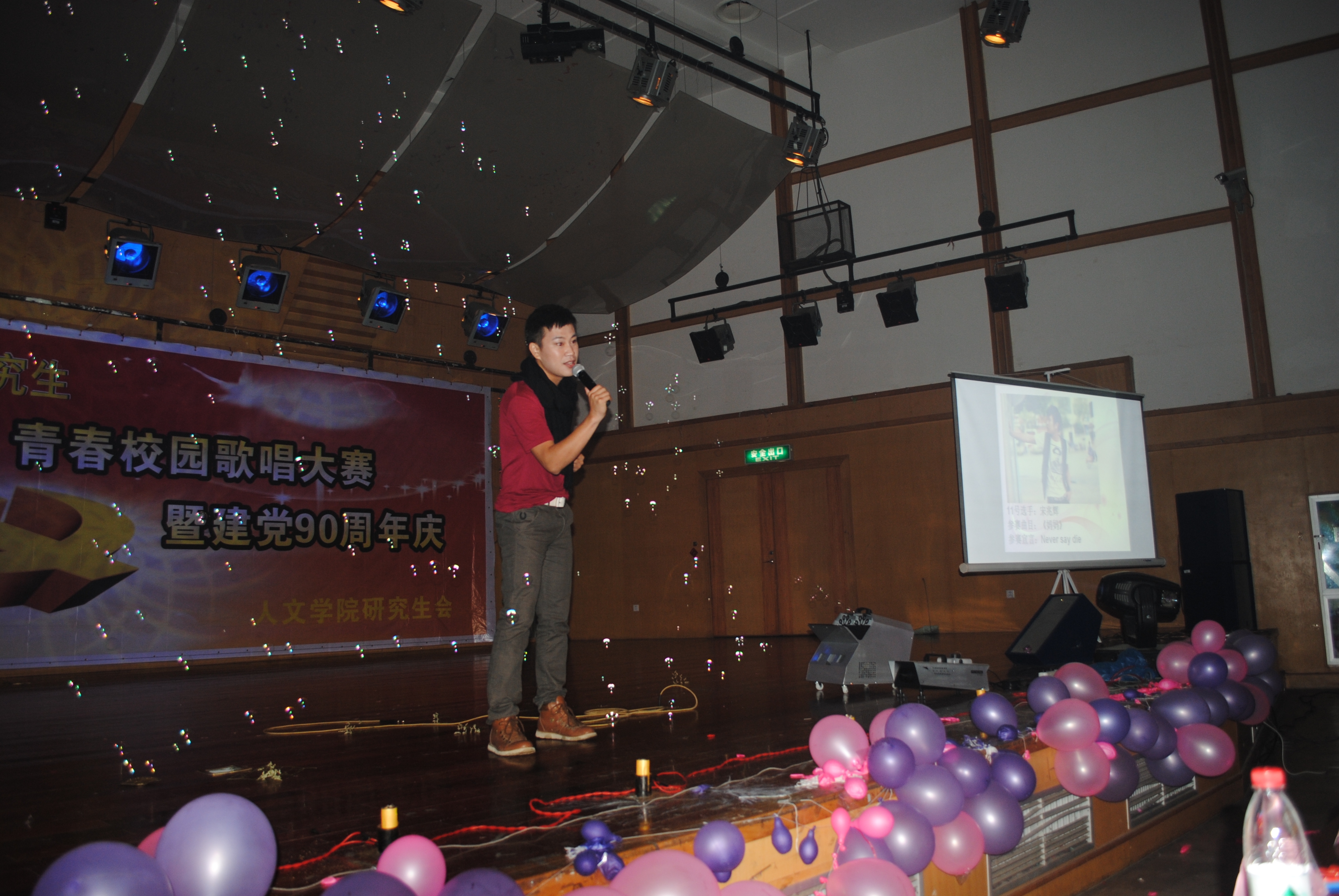 值得一提的是,为庆祝中国共产党成立90周年,大赛还特意设置了两个唱红歌,猜红歌的游戏环节。这些歌把全场的“80后”带进了一个重温中国共产党为了中华大地各族人民抛头颅洒热血的英雄年代,看今朝,忆当年,英雄热血,永记在心。余音绕梁,意犹未尽的大厅里,整场大赛圆满结束在这个火红的夜晚,结束在学子火热的心中。