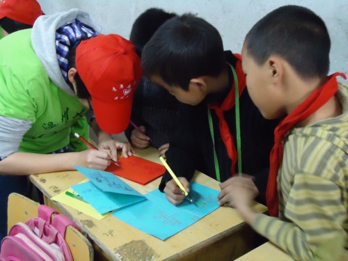 志愿者们与C区集合,一同前往丁岙。去丁岙的一路上可谓艰辛,由于路途较远,交通状况较差,志愿者们经过较长时间颠簸才到达目的地。但一到学校,看到可爱的乖巧的孩子们,志愿者们便疲乏全无,立刻开展起活动。活动伊始,志愿者们先做好了准备工作:贴海报、分组、发卡纸等,一切都有序的进行。在教小朋友做贺卡的过程中,志愿者们耐心而热情,边与小朋友聊,边协助小朋友们做,可谓其乐融融、相亲相爱。小朋友们之间也能互相帮助,传借工具、帮剪纸片、出主意......各位小朋友似乎都想把送给父母的贺卡做成世界上最漂亮的。真的是用心在制作,相信孩子父母看到会很感动的。