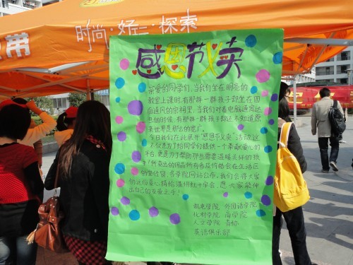 的青年志愿者协会以及英语俱乐部在温大C区凉亭共同合作开展“感恩节义卖”活动。