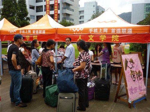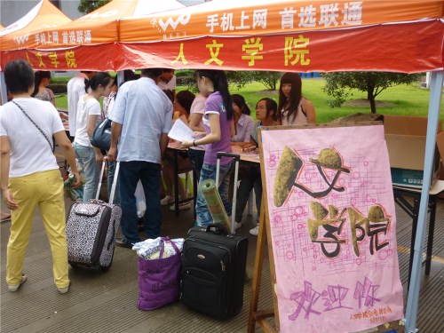 迎新大本营的志愿者,为新生提行李,并带领学生及学生家长领取相关资料。新生会拿到一个新生指南、学生手册、院刊等资料的文件袋,在大本营签到后新生还将领到寝室钥匙,由另几名志愿者协同提行李,引领新生去寝室。这一天,接待处热闹非凡,志愿者们都热情昂扬,积极为新生们提供各种力所能及的服务,大二学生虽因军训冲突,但是仍有不少志愿者自愿利用休息时间为新生服务。接待工作一直持续到晚上九点才基本结束。
