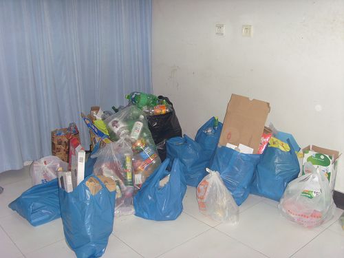 晚上8:50,志愿者们在C区凉亭集合,整装待发。志愿者被分成五组,分别负责C5、C7、C8、C9、C综的宿舍。9点整,宣传废旧物品回收的活动正是开始。志愿者们拿好环保袋,走进每个寝室,努力地宣传,向同学们说明活动的意义及形式。虽然志愿者刚上完自习课,但是大家都不怕辛苦,积极地工作着。在宣传的同时,好多热心的同学就把自己寝室的废旧物品捐了出来,塑料瓶、铝罐、旧台灯、啤酒瓶、废旧报纸、书刊、杂志等等,成果颇丰。由于东西很多很杂必须一类一类的分好,随后志愿者们便将回收的物品进行了整理,浩大的工程在志愿者的努力之下终于完美收工。