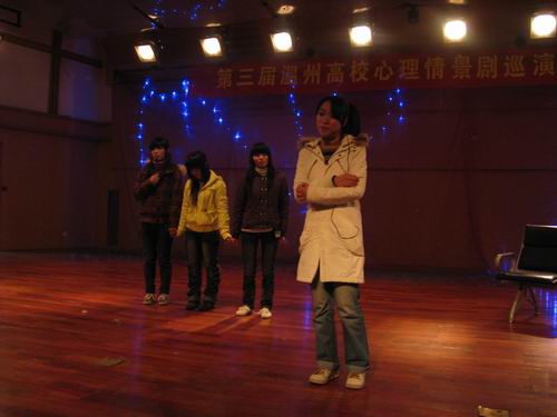代表温州大学参加心理情景剧第一站的演出,充分展现了人文学子的风采和高超的表演技能。心理情景剧的巡演,也使更多同学感受到心理健康的重要性,从而为温州高校心理健康的宣传提供一个良好的平台。