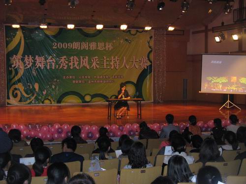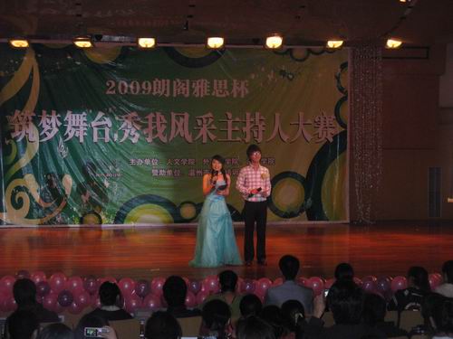 联合举办的2009"朗阁雅思杯"筑梦舞台、秀我风采主持人大赛决赛在北校音乐厅隆重举行。此次大赛的目的在于繁荣校园文化,推进大学生素质拓展,选拔具有一定艺术修养和文化品位的同学代表各院参加学校的决赛。担任此次评委的有丁久萍、杨小敏、陈建跃老师.