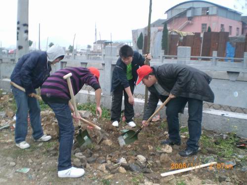 下午1:30分,大家来到了丽岙镇政府。在经过一些安排后,志愿者们便向目的地上坦村出发。一路上,志愿者们将植树护溪的倡议书分发给村民,宣传环保意识。到了上坦村后,大家与其他的志愿者一起,沿着河岸种起了树。志愿者们握着铲子,挥舞着锄头,卖力的将一个个樟树树苗种下去。有的志愿者还将彩带系在树上。虽是有绵绵细雨,但丝毫挡不住大家的热情。最后,在大家的努力下,这些树苗都种了下去,组成了一片"共青林"。