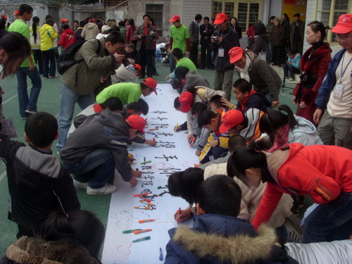 的志愿者表演了唱歌、书法、朗诵、手语等节目,新码道的孩子们也为志愿者表演了唱歌节目。同时联欢会上还进行了画笑脸的游戏,孩子们在志愿者的帮助下在白布上留下了一张又一张的笑脸,各位热情高涨,将联欢会推向了高潮。