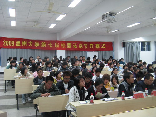 2008年11月20日晚,2008温州大学第七届校园话剧节开幕式在人文楼203教室拉开帷幕。 院党总支副书记魏成春、农历剧社指导老师高光明、院教学科科长杨秀华、学生科科长李浦豪以及辅导员麻法全出席了本次开幕式。