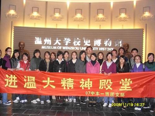 尽管外面是初冬的寒风,却依然挡不住07中本一班同学举行团日活动的热情。11月19日下午,同学们走进位于温大南校区的校史博物馆,共同追溯温大的办学历史和人文发展。今年恰逢温大建校七十五华诞,因此此次活动对同学们意义非凡。
