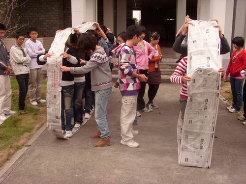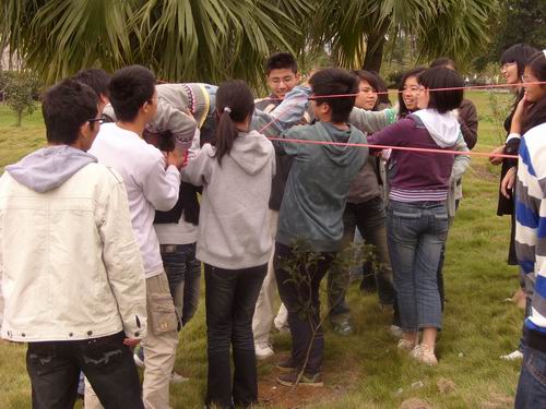 早上8:30分,活动开始。劲爆的音乐点燃了队员们的激情,教室里一改往常的严肃气氛,大家都在此刻随着音乐尽情地释放自己的压力。主讲师一直“鼓动”大家放松自我,兴奋地一起“HIGH”。随后,活动场地换到室外。此后,大家更是积极地参与其中,背摔、越狱、坦克链……特别是坦克链,大家积极地为自己的团队献计献策,游戏还引来了其它澳门六合彩官网 学生的围观并得到好评。