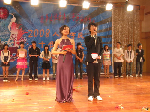 邀请了董博等评委,并请来了茶山声海琴行等进行嘉宾演出,他们的到来为这次比赛增加了不少亮点。选手们精彩的出场秀表演点燃观众们的激情并将晚会气氛推向了第一个高潮。而后参赛的十五位选手各自演唱了自己最为拿手的歌曲,唱出了青春的激情和绚丽,赢得了在场老师和同学的阵阵喝彩。其中,来自08中本 本3班的孟文苗同学以一首《美丽心情》获得老师和同学的一致好评,得到了9.75分的全场最高分并最终捧回一等奖。08历本的相孝锟和05中本1班的徐利光也紧随其后分别获得二三名。十五位选手用自己青春的歌喉演唱着每一首动听的歌曲,那优美的旋律奏响了大学生对未来的憧憬、向往。台下的观众激情回应着那悠扬的旋律,歌声与热烈的欢呼声久久回荡。 随着每个跳跃的音符,在比赛进入尾声之时,特邀嘉宾声海琴行的双吉他弹唱为晚会画上了完美的句号。