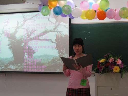 05小教本一的孟晓宁更是出色演绎了一首《饮九月初九的酒》,受到评委们一致青睐。值得一提的是,在诗歌的选材上,部分同学较为注重时政性,如"北京奥运年"和近来颇受关注的"藏独"事件,足见同学对取材的独到与对祖国的热爱。