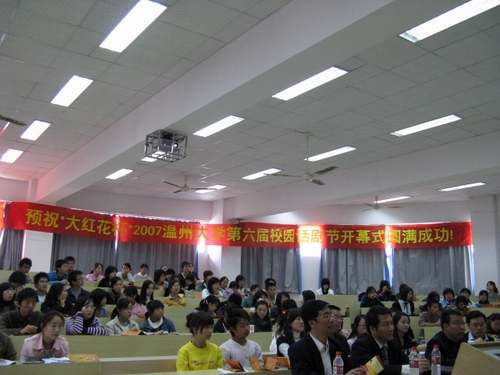 11月21日下午1:30, 以“怀忆百年 演绎经典”为主题的2007年温州大学第六届“大红花”杯校园话剧开幕式在北校区1-203教室隆重举行。本届话剧节有温州市大红花蜂业有限公司鼎立赞助。