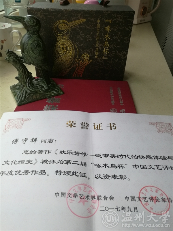 9月26日,由中国文联、中国文艺评论家协会主办的第二届“啄木鸟杯”中国文艺评论2017年度推优活动发布大会在北京中国文艺家之家隆重举行。中国文联党组成员、副主席郭运德、中国文艺评论家协会主席仲呈祥等出席典礼并为获奖者颁发了“啄木鸟”杯和荣誉证书。温州大学特聘教授傅守祥的专著——《欢乐诗学:泛审美时代的快感体验与文化嬗变》获评2017年度“中国文艺评论优秀作品”并应邀参加了颁奖典礼。