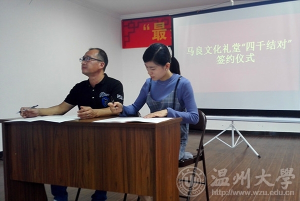 结对志愿团队代表与马良村文化礼堂负责人签署温州市文化礼堂“四千结对”共育目标书。